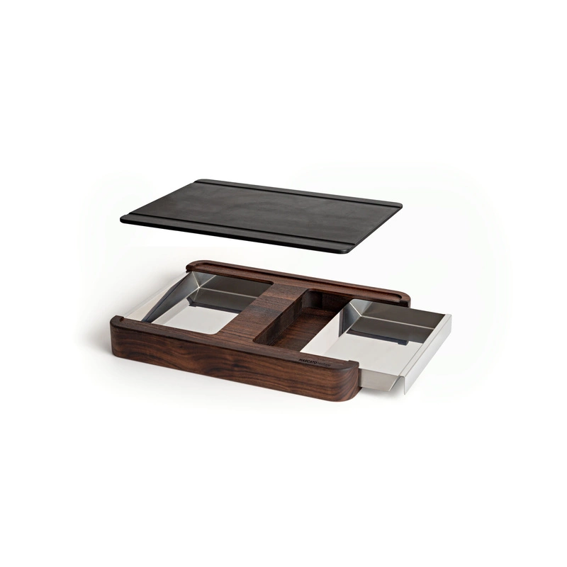 Solidna podstawa z drewna orzechowego ma dwie wyjmowane, zmywalne w zmywarce tace ze stali nierdzewnej, do przechowywania przetworzonego produktu lub odpadów.