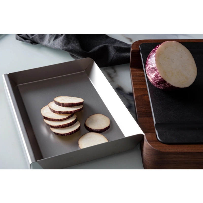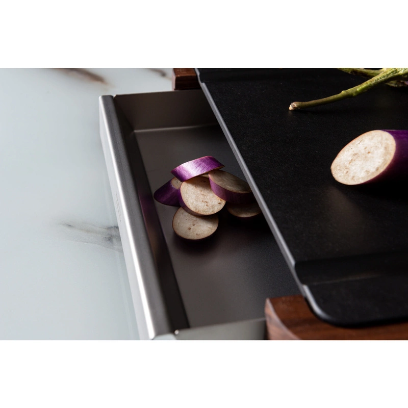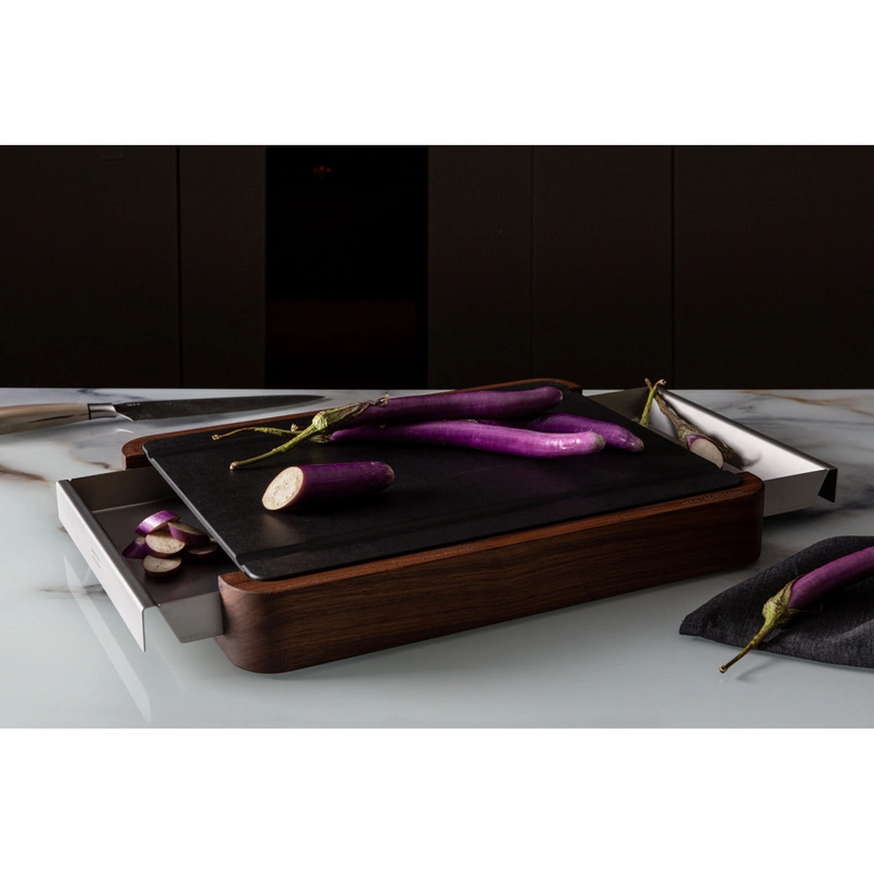 Na górze znajduje się czarna deska do krojenia, wykonana z nadającego się do mycia w zmywarce papieru z recyklingu.