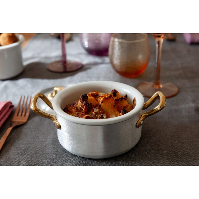 Porcelanowa miska może być używana samodzielnie do pieczenia lub do serwowania przekąsek, owoców, lodów i wszystkiego, co podpowiada Ci wyobraźnia; w połączeniu z naczyniem do zapiekania dołączonym do zestawu pozwala Ci zaprezentować swoje potrawy na stole ze szczególną oryginalnością i elegancją.