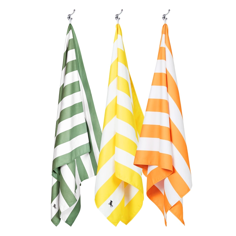 Chwyć szybkoschnący ręcznik plażowy z naszej klasycznej kolekcji Cabana, aby wyeliminować wilgotne zapachy i noszenie ze sobą ogromnego ręcznika ze swojego życia.