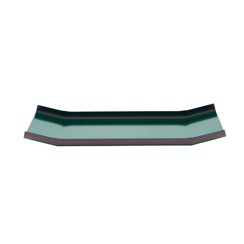 W zależności od perspektywy widza następuje dynamiczne przejście od zieleni do fioletu, które w zaskakujący sposób podkreśla fałdy i krzywizny tacy.