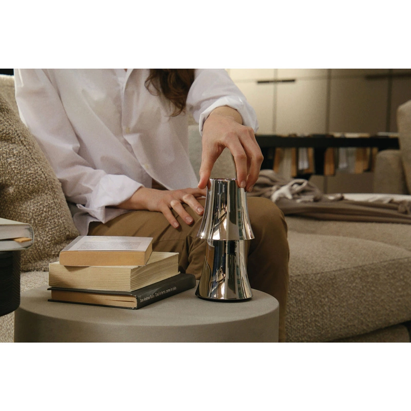 Akumulatorowa lampa LED ze stali nierdzewnej 18/10 i żywicy termoplastycznej.