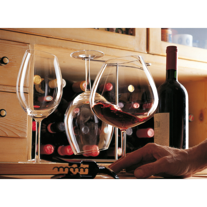 Zestaw 2 kieliszków do czerwonego wina, z przezroczystego szkła dmuchanego, charakteryzującego się skośnym ścięciem górnej krawędzi i dużymi wymiarami.