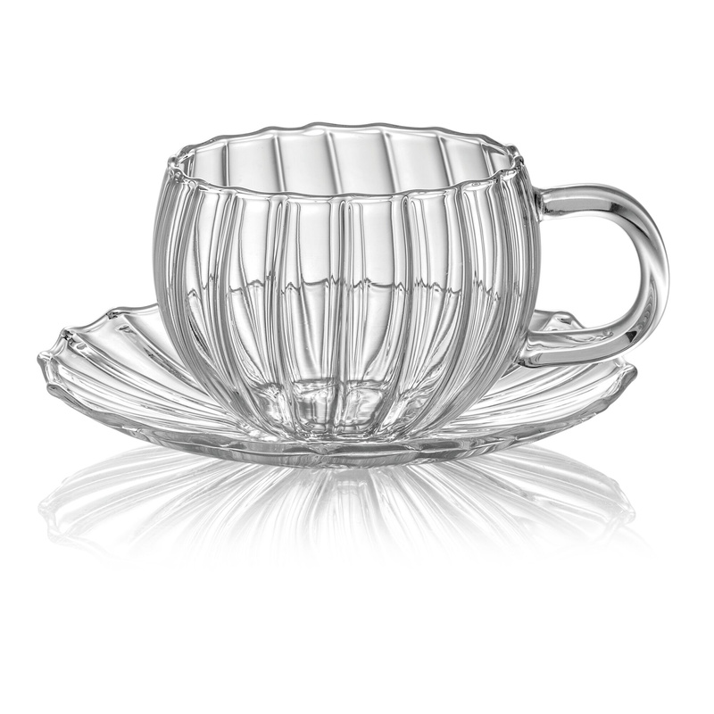 Zestaw 2 filiżanek ze spodkami ze szkła borokrzemianowego, z plisowaną powierzchnią zewnętrzną.