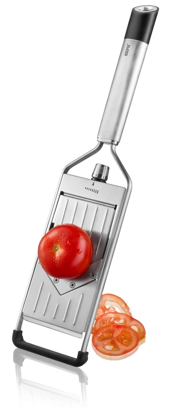 Krajalnica PRIMELINE to doskonałe narzędzie kuchenne, które pozwala w szybki i precyzyjny sposób kroić owoce i warzywa na równe plasterki o grubości od 0 do 5 mm. Dzięki ultraostremu ostrzu w kształcie litery V wykonanemu z wysokiej jakości stali nierdzewnej, urządzenie bez trudu radzi sobie zarówno z delikatnymi pomidorami, jak i twardymi warzywami korzeniowymi.
