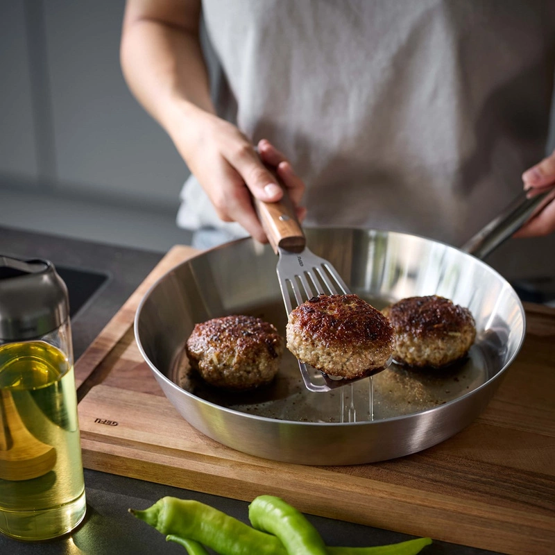 Solidna, nitowana rękojeść wykonana z drewna orzechowego zapewnia komfortowy chwyt i stabilność podczas użytkowania, a jej naturalna estetyka dodaje kuchni wyjątkowego charakteru. Dodatkowo perforowana konstrukcja pozwala na szybkie odcedzanie tłuszczu i płynów, co sprawia, że szpatułka jest niezwykle praktyczna w codziennym gotowaniu.