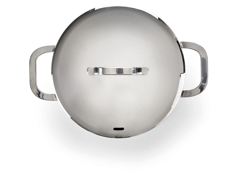 - Pokrywa ze stali nierdzewnej z otworami wentylacyjnymi umożliwia ujście pary