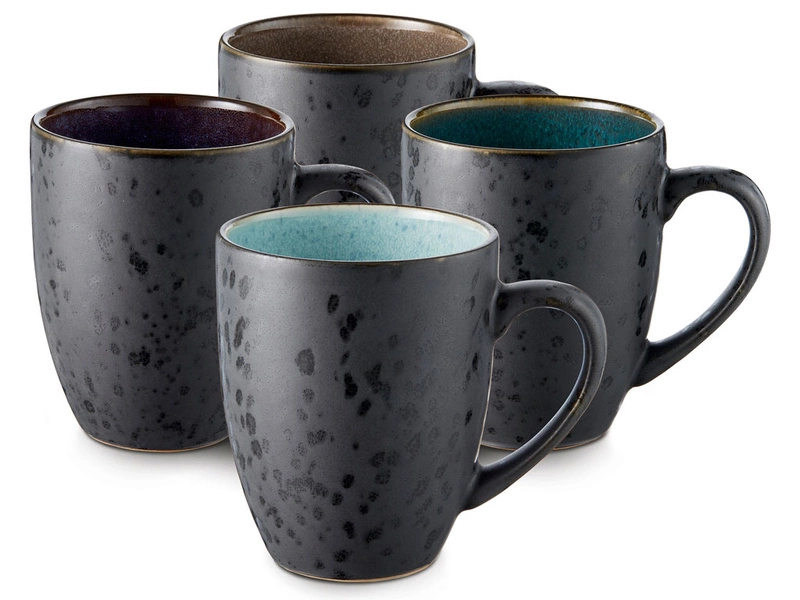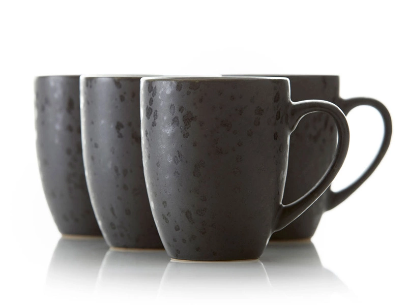 Zestaw kubków z uchwytem wykonany z wytrzymałej kamionki z matową czarną powierzchnią zewnętrzną i 4 błyszczącymi glazurami wewnątrz. Kubek ma 10 cm wysokości i ma pojemność 300ml.