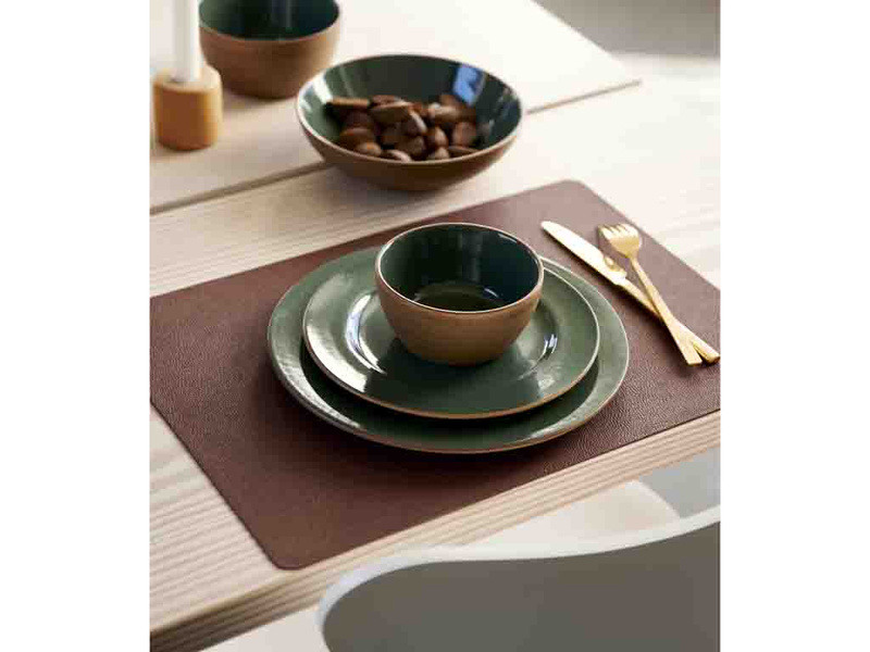 Dwustronne podkładki pod talerze o praktycznym wyglądzie zmywalnej skóry, które tworzą nakrycia stołu o surowym i nowoczesnym wyglądzie.