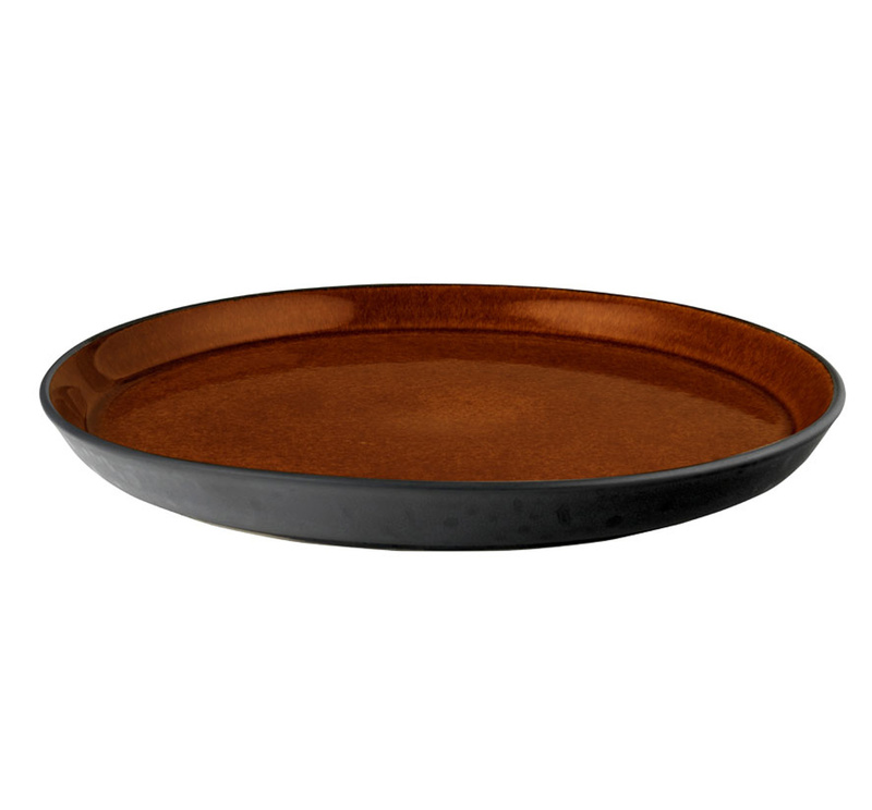 Talerz o średnicy 27 cm został wykonany z kamionki wykończonej na zewnątrz czarną, matową glazurą, a od środka, błyszczącą w kolorze bursztynu.