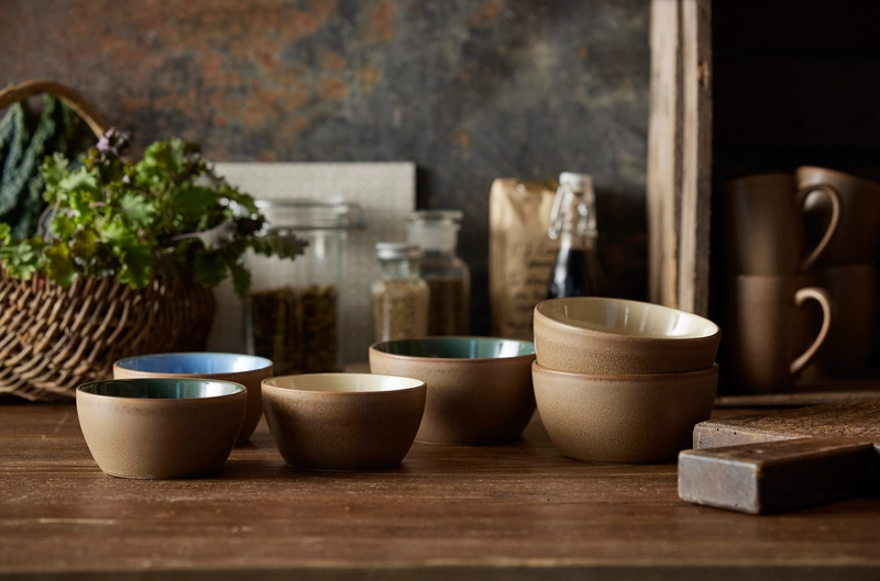 Matowe, brązowe szkliwo na zewnątrz pięknie łączy się z błyszczącym, błękitnym szkliwieniem w środku misy.