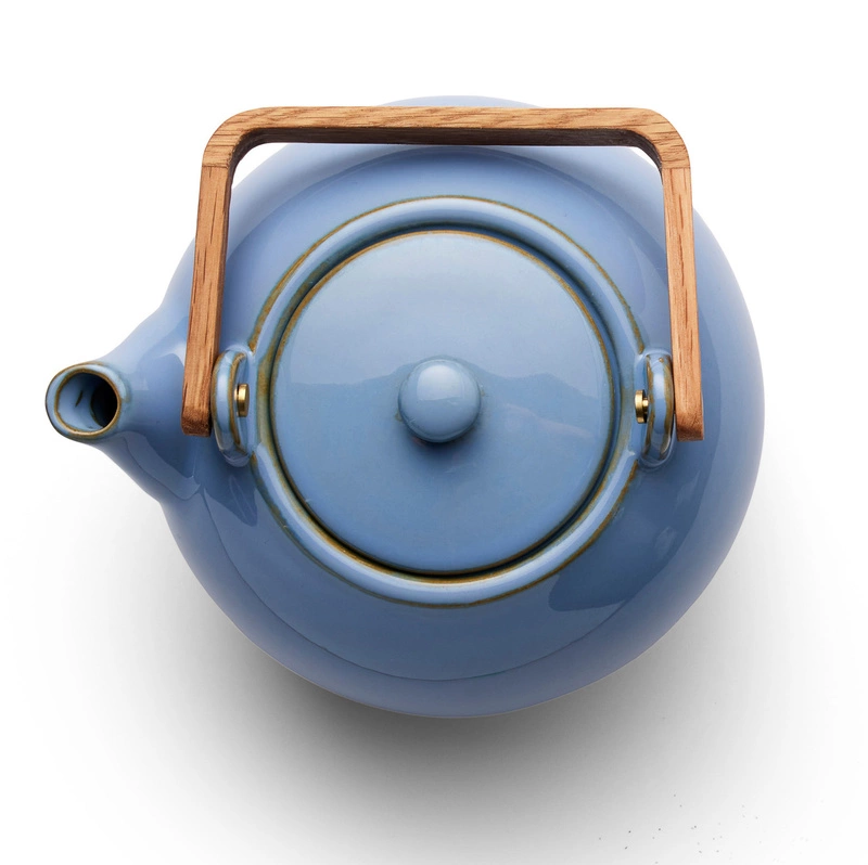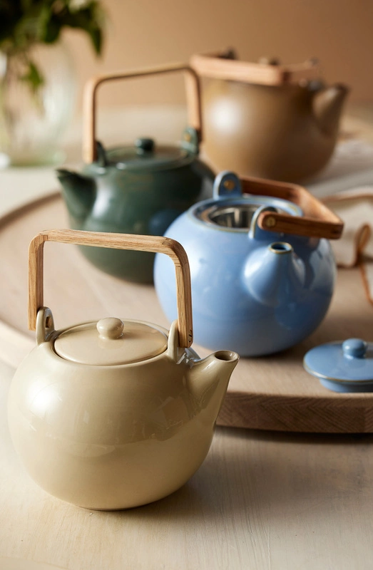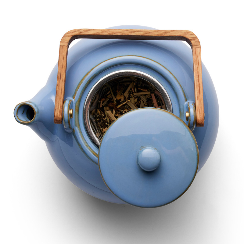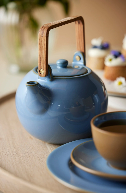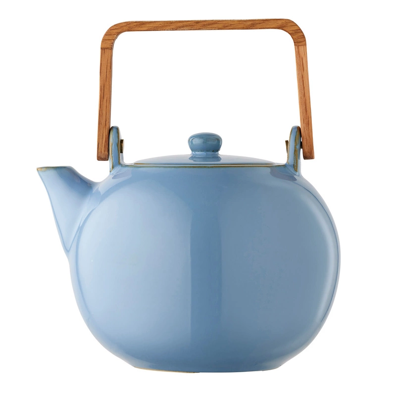 Czajnik BITZ ma pojemność 1,2 litra, jest wykonany z wytrzymałej kamionki z wykwintnym, reaktywnym szkliwieniem i jest wyposażony w rustykalny dębowy uchwyt z mosiężnymi nitami. W środku znajduje się sitko do zaparzania.