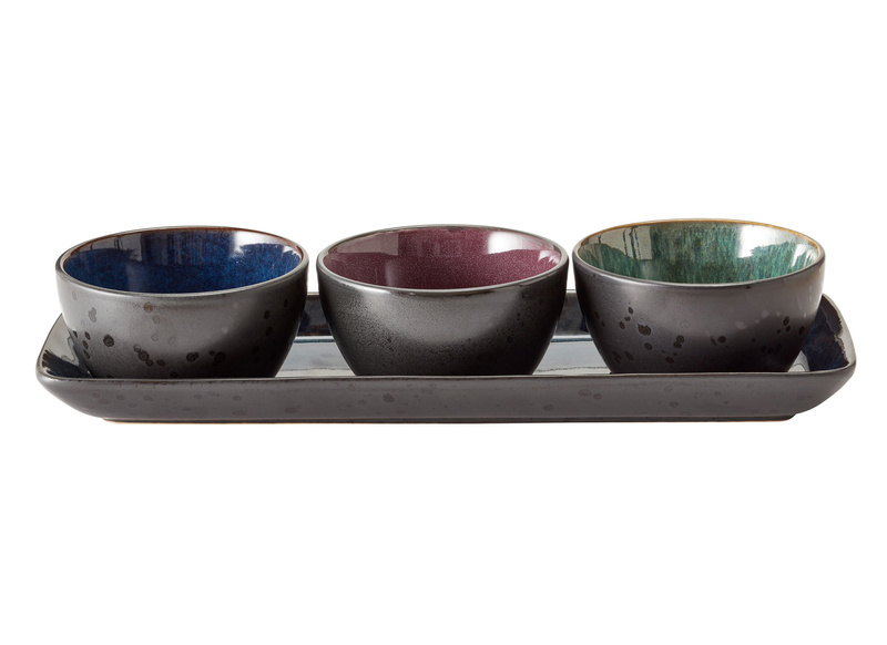 Zestaw Bitz do tapas zawiera talerz i trzy miseczki kamionkowe. Wszystkie elementy mają matową czarną glazurę na zewnątrz i błyszczącą glazurę w środku. Talerz w środku pokryty jest glazurą w kolorze granatowym, a trzy 12-centymetrowe miski mają zielone, różowe i granatowe wnętrze.
