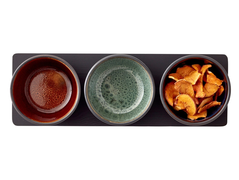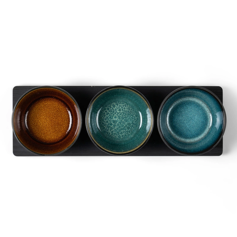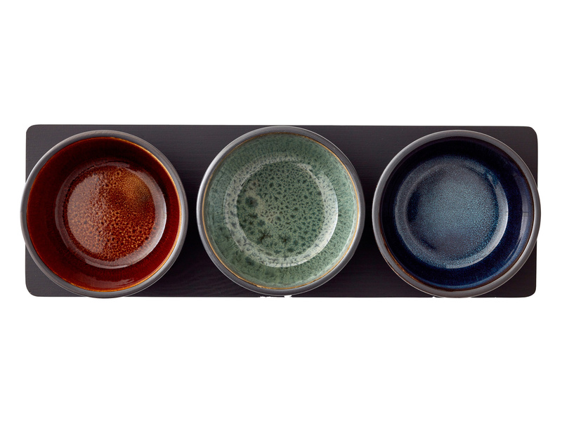 Zestaw marki Bitz zawiera bejcowaną na czarno drewnianą tacę i trzy kamionkowe miski. Połączenie zewnętrznej matowej glazury i trzech różnych błyszczących glazur (niebieskiej, bursztynowej i zielonej) po wewnętrznej stronie misek, tworzy niepowtarzalny wygląd.