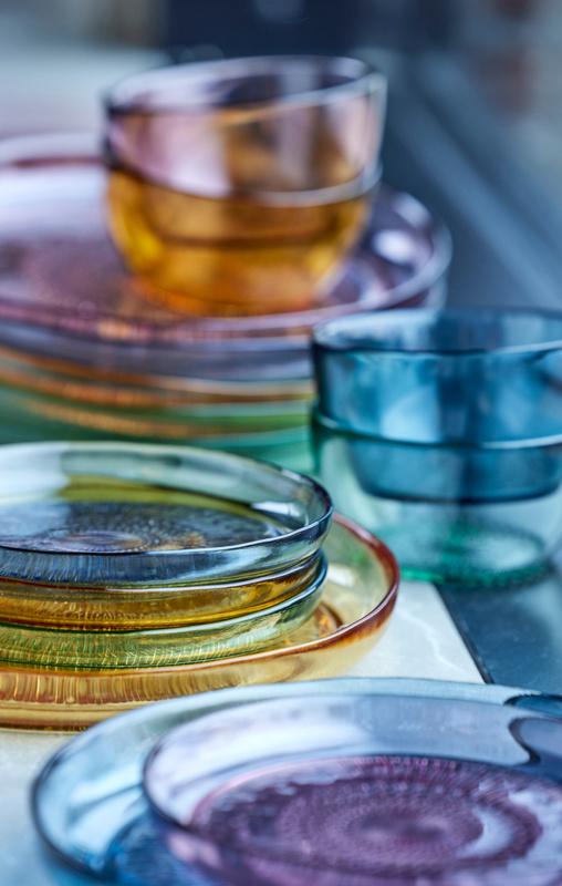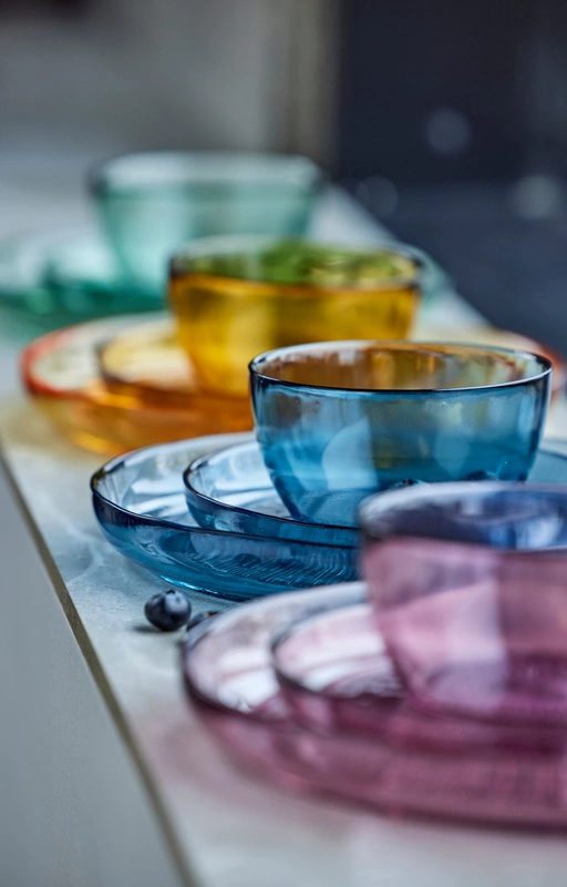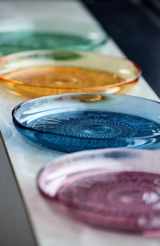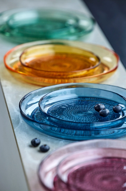 Talerz wykonany z barwionego szkła doskonale sprawdzi się do serwowania różnych dań, sałatek, kanapek lub przekąsek. Proste wzornictwo nadaje elegancji produktowi, na uwagę zasługuje ciekawie zdobione dno talerza.