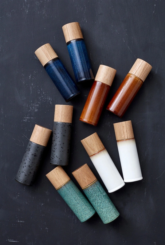 Zestaw młynków do soli i pieprzu marki Bitz wykonany z błyszczącej glazurowanej kamionki oraz z drewna dębowego.