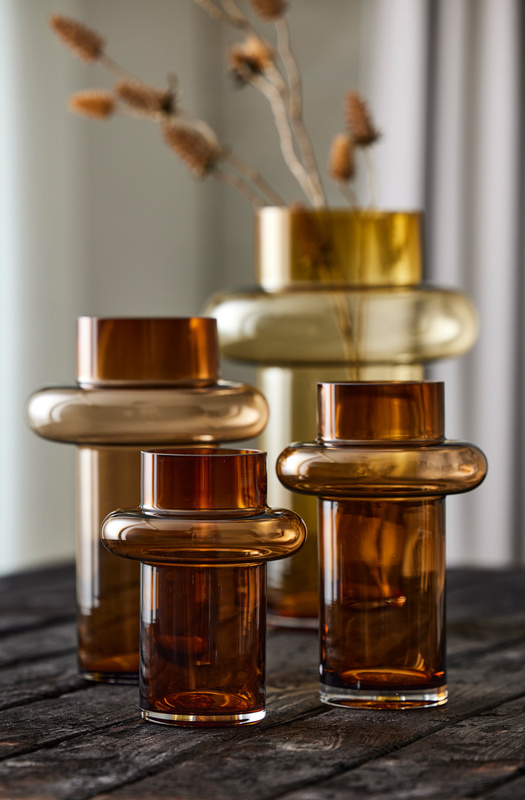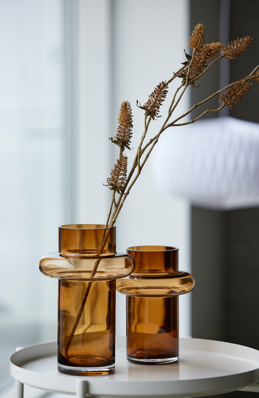 Produkt jest ręcznie wykonany z kolorowego szkła. Unikalny design sprawia, że wazon jest rzeźbą samą w sobie, a jego prosty i nowoczesny kształt będzie doskonałym tłem zarówno dla świeżych, jak i suszonych kwiatów.