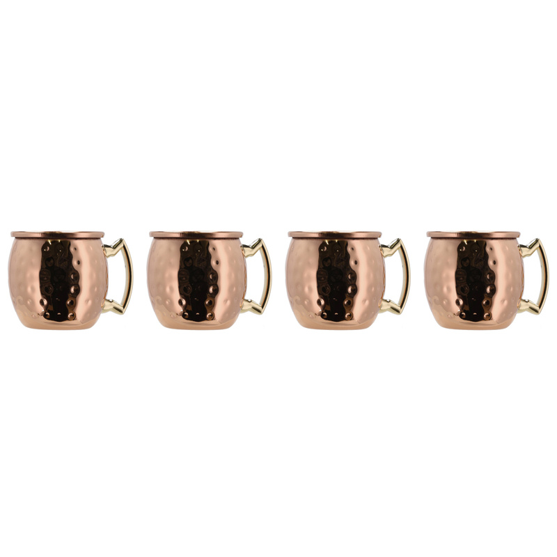 Zestaw 4  kieliszków do wódki z uchwytem, wykonanych z młotkowanej stali w kolorze miedzianym. Taki kształt jest charakterystyczny dla naczynia do serwowania popularnego koktajlu Moscow, który przeżywa renesans. Moscow Mule składa się z piwa imbirowego, wódki, soku z limonki i dużej ilości kostek lodu.