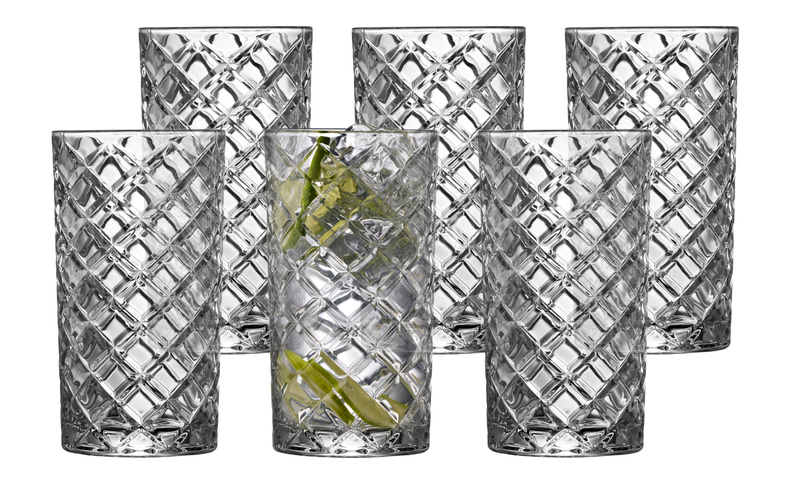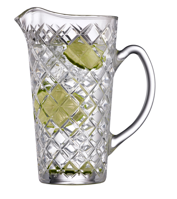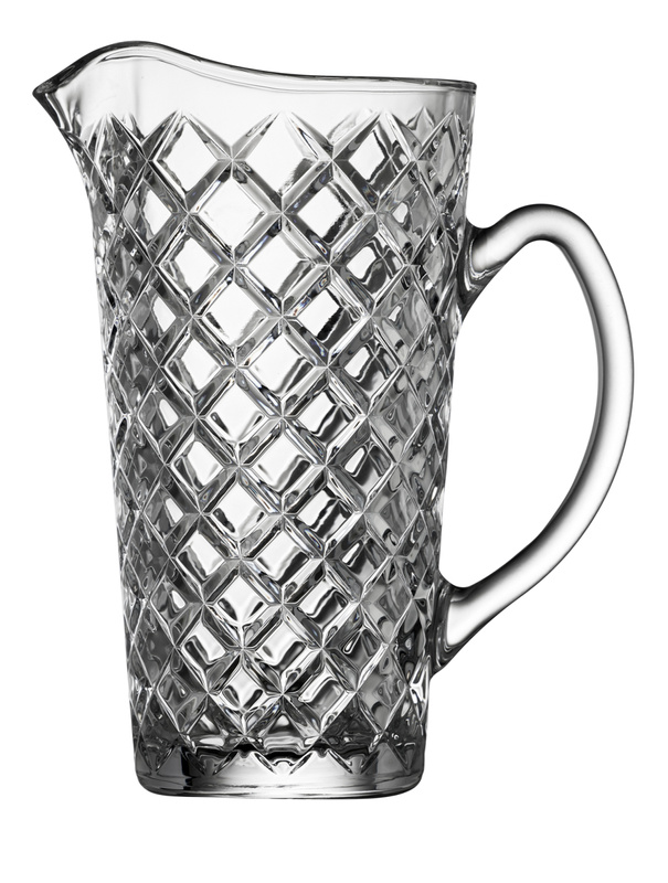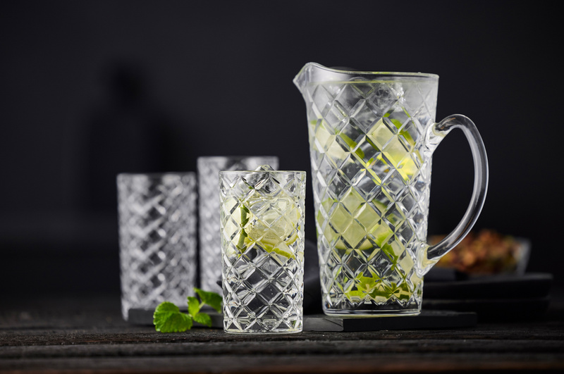 Dzbanek o pojemności 1,3 l i wysokości 23 cm oraz 6 szklanek o pojemności 410 ml i wysokości 14,5 cm ozdobione motywem diamentowym.