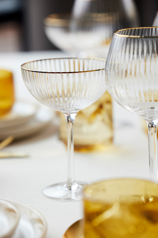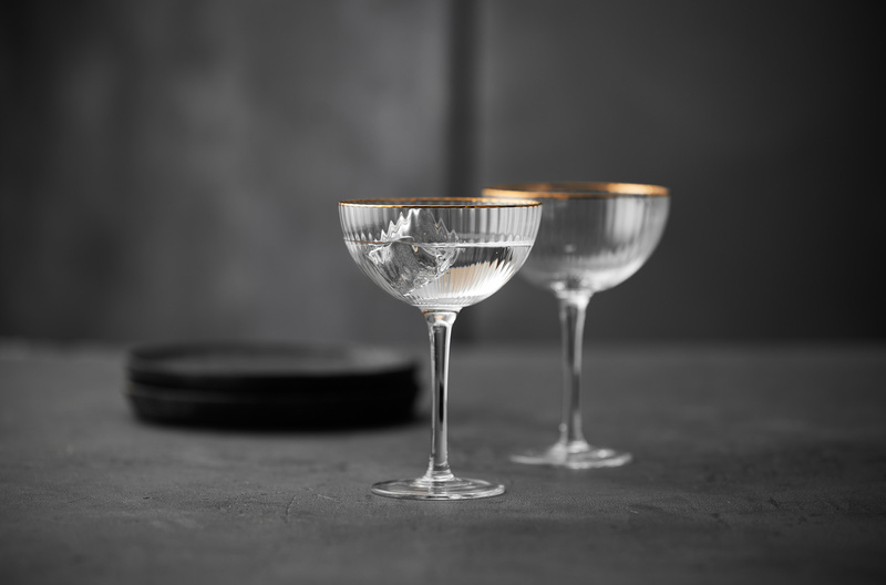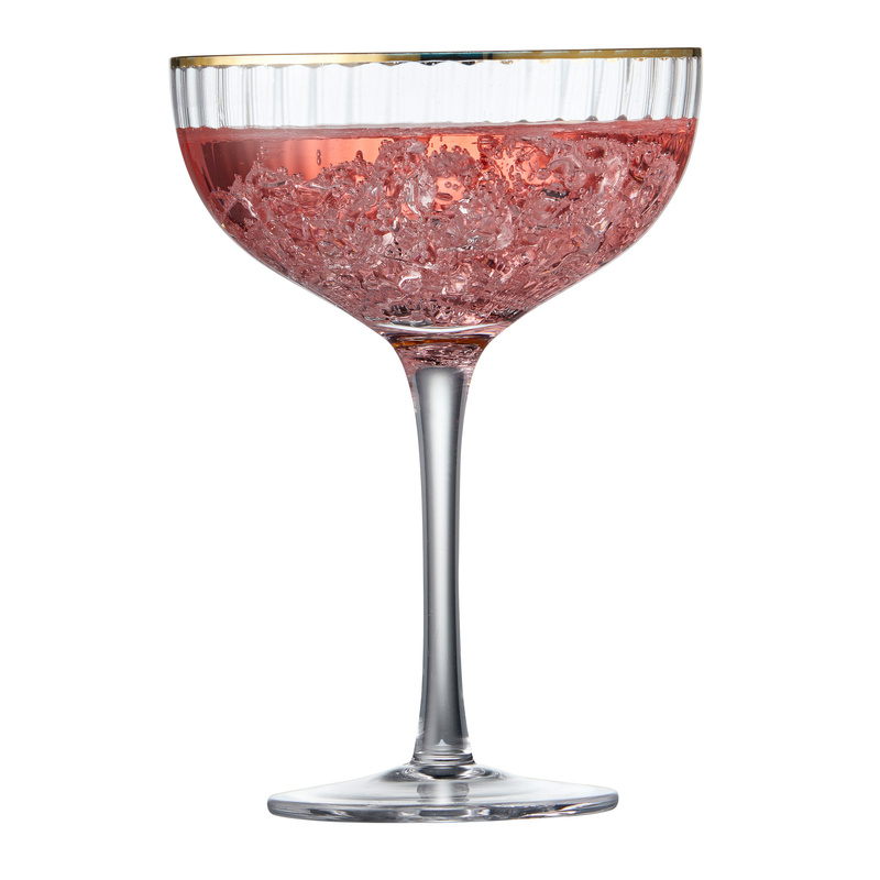 Kieliszki do koktajli wykonane z karbowanego szkła dodatkowo ozdobionego złotą obwódką. Elegancki, wysublimowany design, sprawia, że produkt ten prezentuje się lekko i eterycznie, gładko łącząc styl vintage z nowoczesnością.