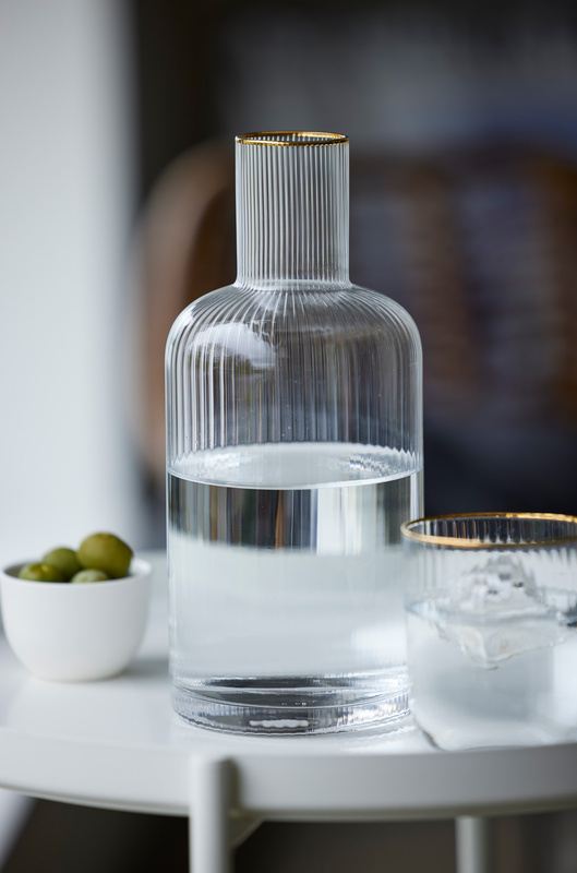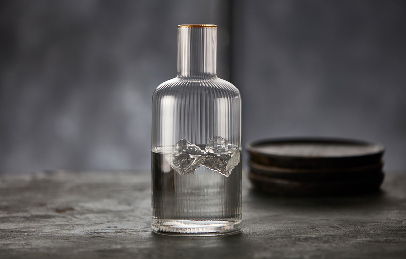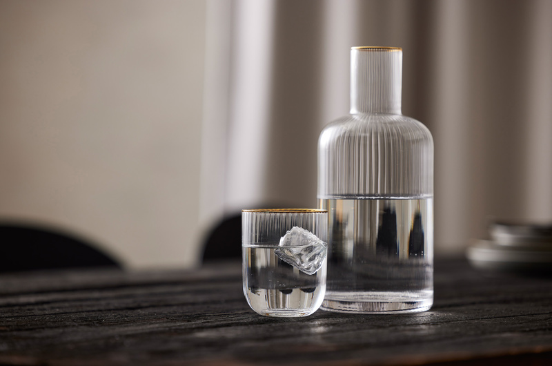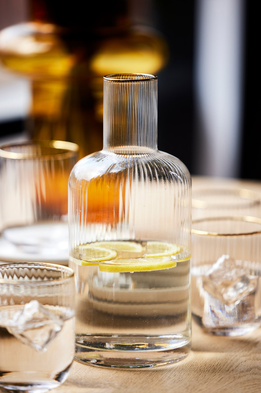 Karafka do wody wykonana z karbowanego szkła dodatkowo ozdobionego złotą obwódką. Elegancki, wysublimowany design, sprawia, że produkt ten prezentuje się lekko i eterycznie, gładko łącząc styl vintage z nowoczesnością.