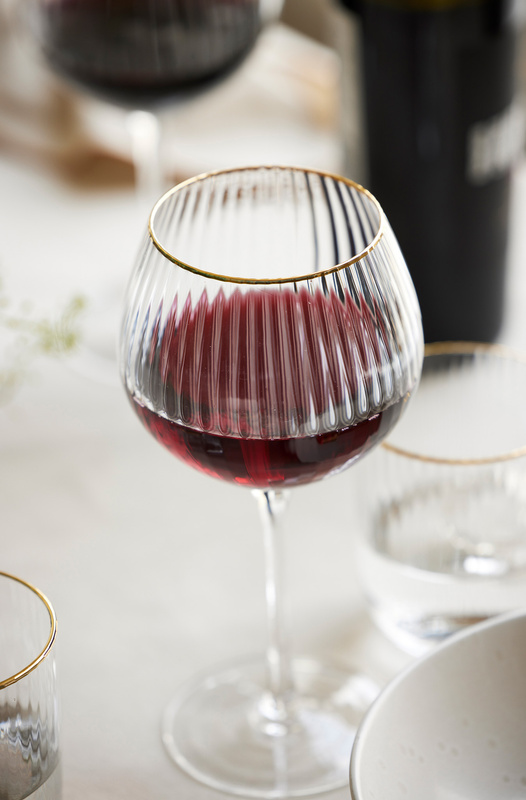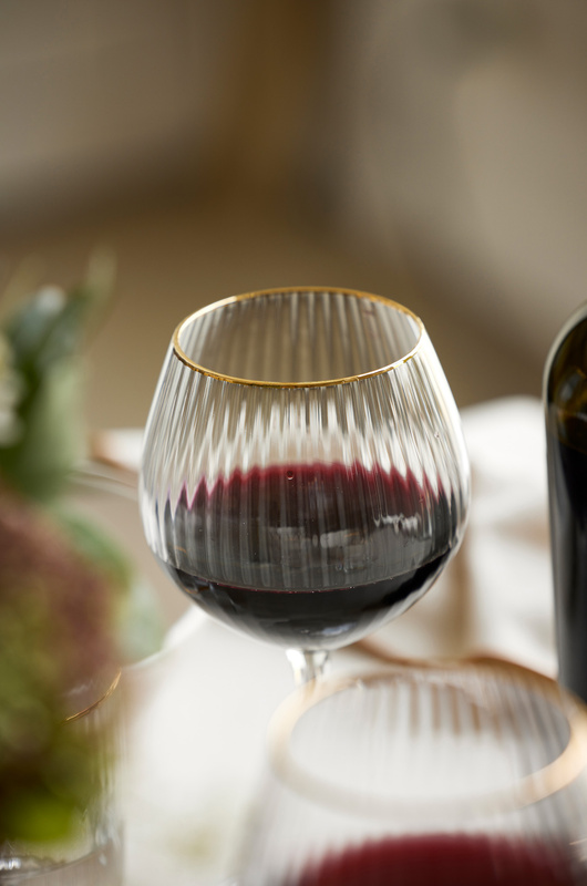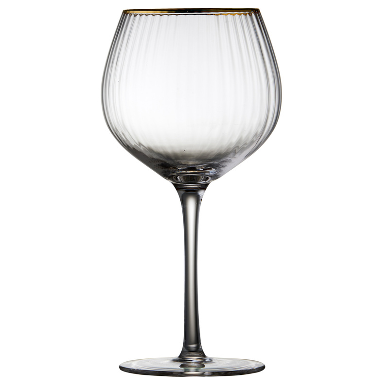 Kieliszki do ginu wykonane z karbowanego szkła dodatkowo ozdobionego złotą obwódką. Elegancki, wysublimowany design, sprawia, że produkt ten prezentuje się lekko i eterycznie, gładko łącząc styl vintage z nowoczesnością.