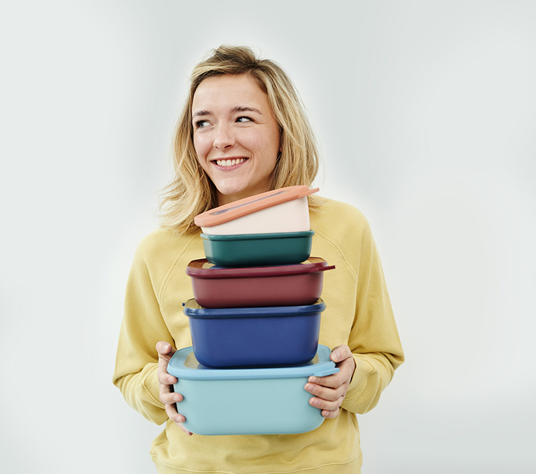 Korzystając z produktów tej serii, zyskujesz również dodatkową przestrzeń. Prostokątne miski dopasowują się do ścianek szafy, lodówki i zamrażarki. Puste pojemniki możesz ułożyć w stos lub schować do tych o większych rozmiarach.