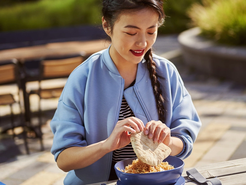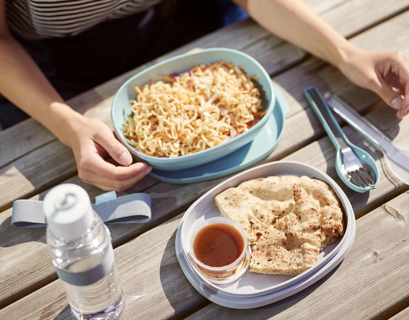 Ogromną zaletą lunchboxa Ellipse Duo jest możliwość odgrzewania posiłków w mikrofalówce (bez górnej przekładki), ciepłe danie z makaronem lub ryżem, z tym pojemnikiem to żaden problem.