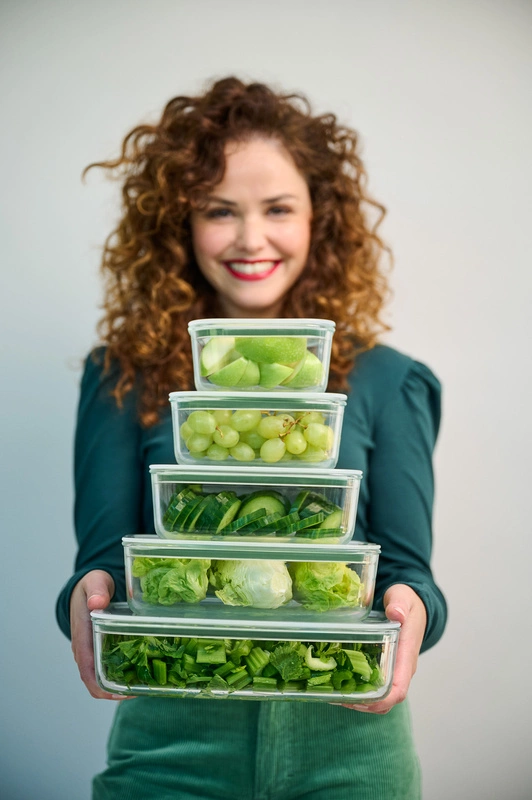 Produkt można piętrować, co pozwala zaoszczędzić przestrzeń i w przemyślany sposób zagospodarować miejsce w szafkach, lodówce, zamrażalniku.