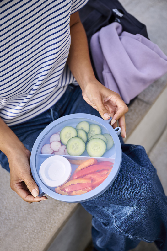 Miska Vita o pojemności 1500 ml, to świetne rozwiązanie dla każdego, kto chce zabrać swój ulubiony posiłek ze sobą do pracy, na uczelnie czy na wycieczkę. Kolekcja oferuje szeroką paletę kolorystyczną, obejmującą przyjemne, przykuwające wzrok kolory. Miska posiada dwa dodatkowe wyjmowane pojemniki Bento oraz tacę, które świetnie oddzielają poszczególne składniki posiłków. Naczynie oferuje w sumie aż pięć niezależnych przegródek. Zyskujesz nowe możliwości kompozycji potraw, a mieszając dressing z sałatką tuż przed spożyciem, wszystkie składniki pozostaną chrupiące i świeże. Ogromnym atutem tego naczynia, jest zakręcana pokrywa, która jest bardzo szczelna. Zabierając miskę Vita w podróż, nie trzeba się obawiać o wylanie zawartości, a jedzenie zachowa swój aromat. Jest to również świetny wybór dla osób lubiących spożywać lunch na ciepło – jedzenie w misce Vita można podgrzewać w kuchence mikrofalowej, należy pamiętać jedynie, aby pokrywę w czasie podgrzewania luźno położyć na misce.