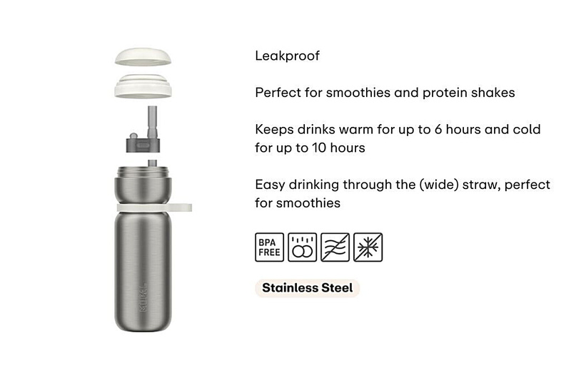 • Wygodny ustnik ze słomką – szeroka słomka ułatwia picie nawet gęstych napojów, takich jak smoothie czy shake'i proteinowe, zapewniając komfortowe użytkowanie bez ryzyka rozlania.