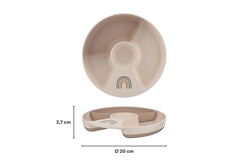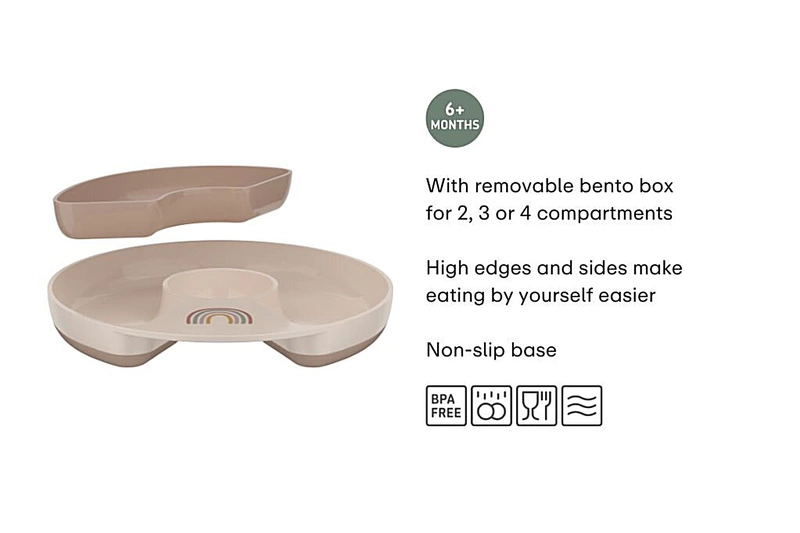 Wykonany z trwałego materiału (PP, TPE) wolnego od BPA, talerzyk gwarantuje bezpieczny kontakt z żywnością. Jego wysokie krawędzie oraz zaokrąglone rogi ułatwiają nabieranie jedzenia, a antypoślizgowa podstawa zapewnia stabilność nawet podczas najbardziej aktywnych posiłków. Dodatkowym atutem jest wyjmowany pojemnik bento, który pozwala na praktyczne dzielenie posiłków na 2, 3 lub 4 oddzielne przedziały, umożliwiając serwowanie różnych smaków w jednym daniu. Talerzyk jest wielofunkcyjny – można go używać w mikrofalówce, zmywarce, a także w lodówce i zamrażarce, co czyni go idealnym towarzyszem codziennych wyzwań.