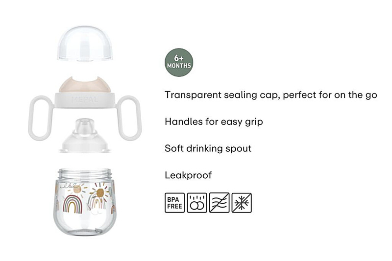 - Kluczowe cechy: Miękka końcówka do picia, ergonomicznie zaprojektowane rączki, przezroczysta pokrywka, konstrukcja zapobiegająca rozlewaniu, możliwość mycia w zmywarce, materiał nadający się do recyklingu