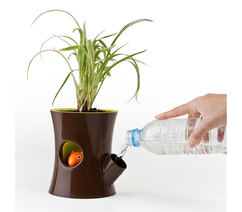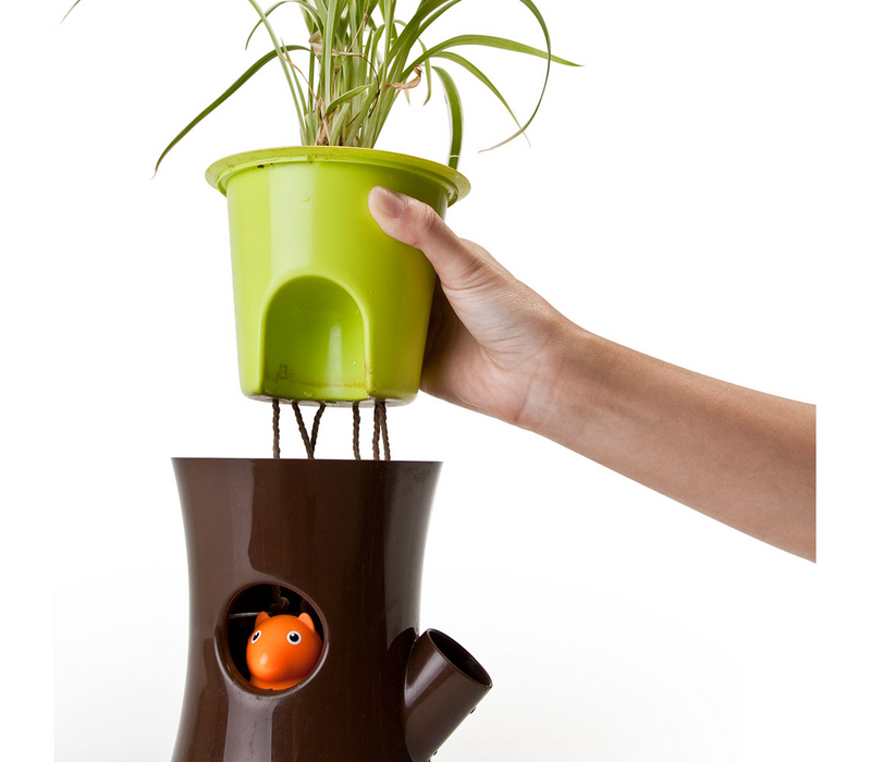 Szczęśliwa wiewiórka jest tutaj, by pilnować Twoich roślin i odpowiedniego ich nawodnienia. Po napełnieniu wodą doniczki, wynurza się, a ukrywa się, kiedy zajdzie potrzeba ponownego napełnienia doniczki. Ta samonawadniająca się doniczka utrzymuje rośliny przy życiu i zdrowo, bez względu na to, jak intensywne jest Twoje życie. Znajdujący się w środku sznurek, działa jak sztuczny korzeń do poboru wody, więc nie musisz codziennie podlewać roślin.