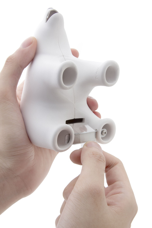 Na nogach ma ostrze do przecięcia taśmy, a otwór w paszczy magazynuje spinacze.