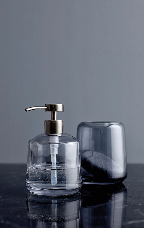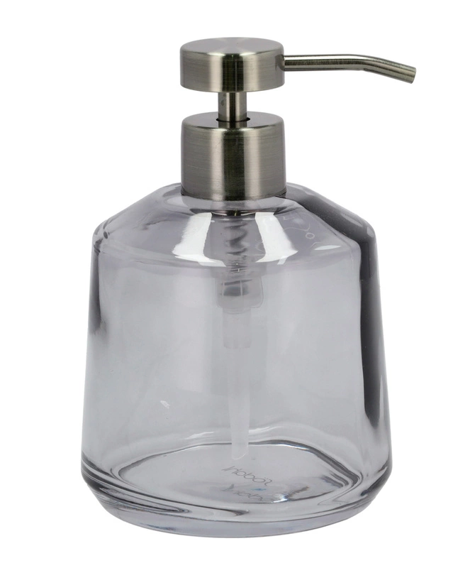 Elegancki dozownik do mydła wykonany z barwionego szkła ozdobiony metalowym wykończeniem w kolorze szczotkowanego, oksydowanego metalu.