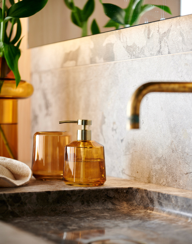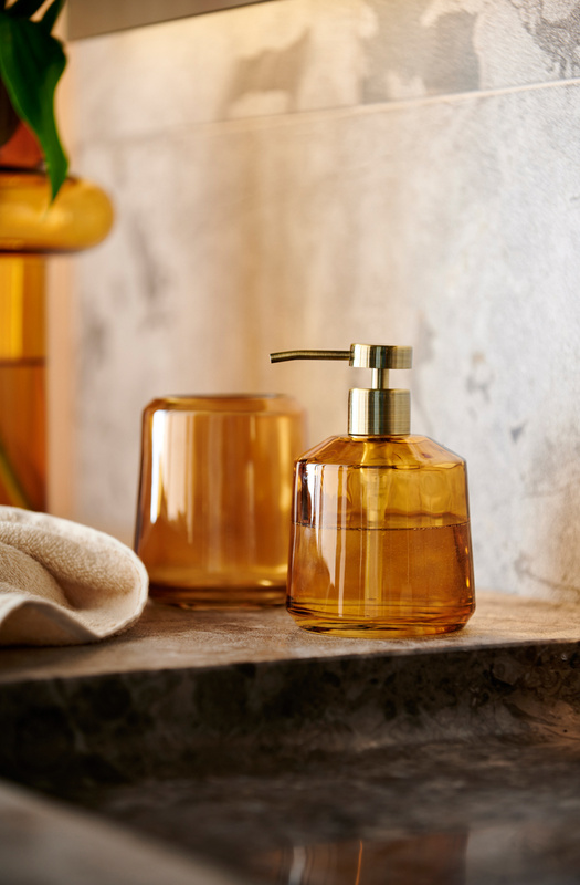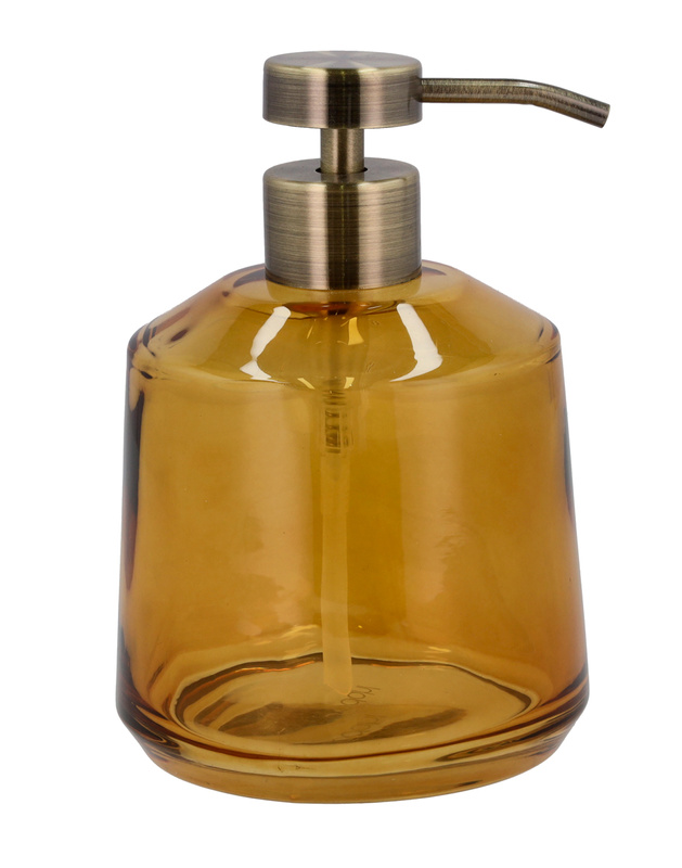 Elegancki dozownik do mydła wykonany z barwionego szkła ozdobiony metalowym wykończeniem w kolorze szczotkowanego mosiądzu.