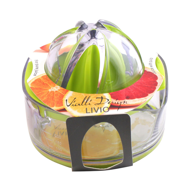 Praktyczny i funkcjonalny wyciskacz do cytrusów Livio marki Vialli Design. Produkt został wykonany z najwyższej jakości tworzywa sztucznego. Wyciskacz posiada dwa dzióbki przez które w zależności od potrzeb można wylać sok wraz z miąższem lub czysty sok. Produkt został wyposażony w podziałkę odmierzającą pojemność w Oz, cup oraz ml oraz w antypoślizgową podstawę zapobiegającą przesuwaniu. Dzięki specjalnej nasadce można wyciskać również sok z większych owoców jak np pomarańczy. Wyciskacz mieści około 200-250 ml soku.