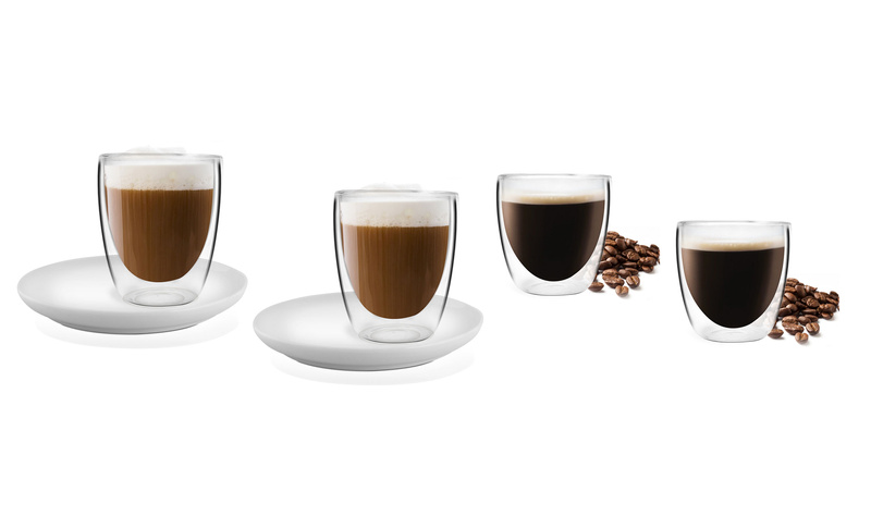 Zestaw czterech uroczych szklanek z podwójną ścianką wraz z dwoma porcelanowymi spodkami z serii Amo marki Vialli Design.