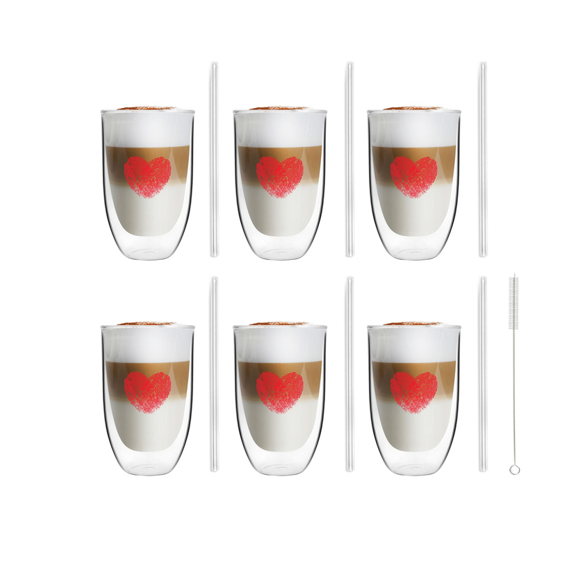 Zestaw 6 szklanek o pojemności 350ml z serii Vita Heart oraz 6 szklanych słomek Vita o długości 20 cm w kolorze transparentnym. W komplecie znajduje się również czyścik/szczoteczka do rurek. Szklanki termiczne Vita Heart wykonane są ręcznie z wysokiej jakości szkła borokrzemowego. Podwójna ścianka izoluje, dzięki czemu zachowana jest odpowiednia temperatura napoju przed dłuższy czas. Szklanki nadają się zarówno do serwowania kawy, herbaty, jak również zimnych napojów i drinków. Produkty nadają się do użytku w zmywarkach, jednak ze względu na delikatne, cienkie szkło, rekomendowane jest mycie ręczne.