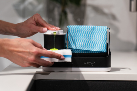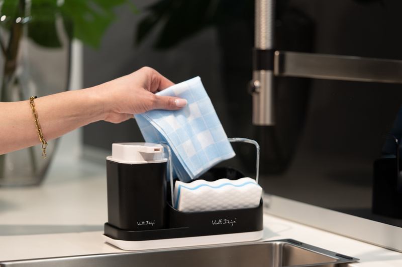 Dozownik na płyn do mycia naczyń o pojemności 350 ml to idealny sposób na przechowywanie detergentu w wygodnym miejscu i w eleganckim stylu. Tacka pozwala na odprowadzenie nadmiaru wody z gąbki, dzięki czemu nie tylko dbasz o funkcjonalność, ale także o higienę. Jest to bowiem skuteczny sposób na ograniczenie namnażania się mikroorganizmów, bakterii i grzybów. Woda spływa ze zmywaka kuchennego do pojemnika, który możesz regularnie opróżniać. Organizer jest także wyposażony w wieszak na ścierkę. Jest to niezwykle użyteczne, gdy chcesz wytrzeć mokry talerz lub ręce po skończonym zmywaniu. Już nigdy więcej nie będziesz musiał rozglądać się po całej kuchni, gdzie jest ręcznik.