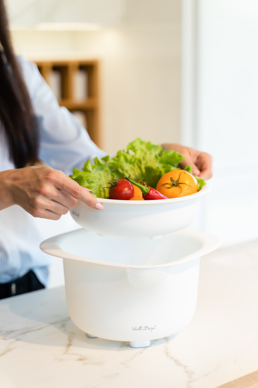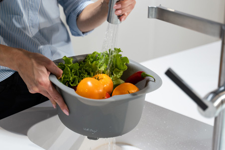 Górny i dolny durszlak z łatwością można włożyć do głębokiej miski – unikniesz w ten sposób kapania wody na stół. Ty możesz w tym czasie zająć się krojeniem innych produktów lub zacząć nakrywać do stołu.