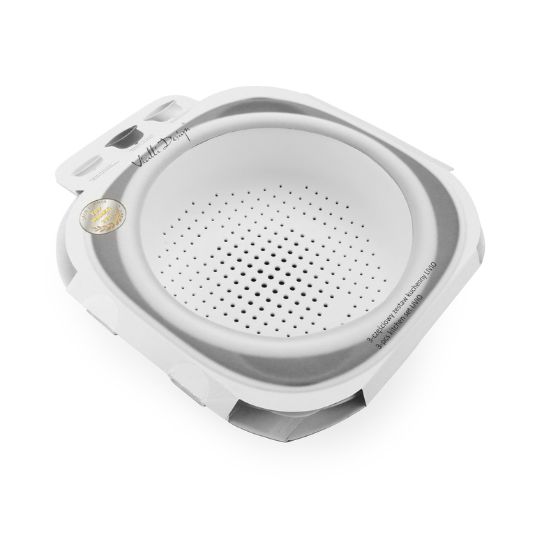 Wszystkie elementy zostały wykonane z wysokiej jakości tworzywa sztucznego przeznaczonego do kontaktu z żywnością. Dodatkowo można je myć w zmywarce lub ręcznie, pod bieżącą wodą. Dużym atutem jest też fakt, że płaska konstrukcja dolnej części pojemnika zapewnia doskonałą stabilność. Kiedy akcesoria nie są używane, można je złożyć razem do miski i zaoszczędzić tym samym wiele miejsca w szafce.