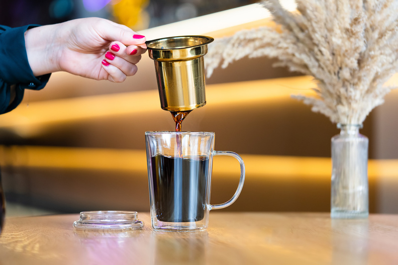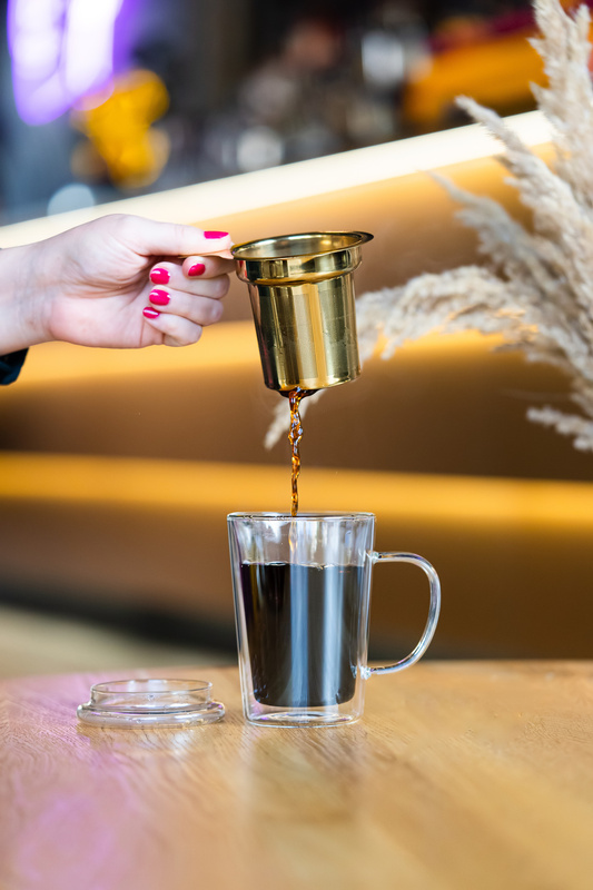 Część zaparzająca zatrzymuje fusy w środku, pozostawiając klarowną herbatę w szklance.