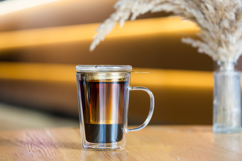 Elegancka i praktyczna szklanka posiadająca w środku wyjmowany zaparzacz wykonany ze stali nierdzewnej w kolorze złotym, do którego wsypujemy herbatę liściastą lub granulowaną.