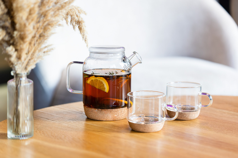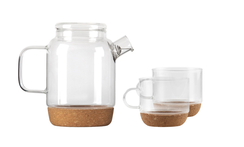 Zarówno dzbanek jak i szklanki od spodu posiadają zdejmowane nakładki wykonane z korka, które są nie tylko atrakcyjnym wizualnie dodatkiem, ale również zapobiegają rysowaniu blatu. Ponadto korkowe podkładki zapobiegają ślizganiu się naczyń, zwiększają ich przyczepność, czynią je jeszcze bardziej stabilnymi i funkcjonalnymi.