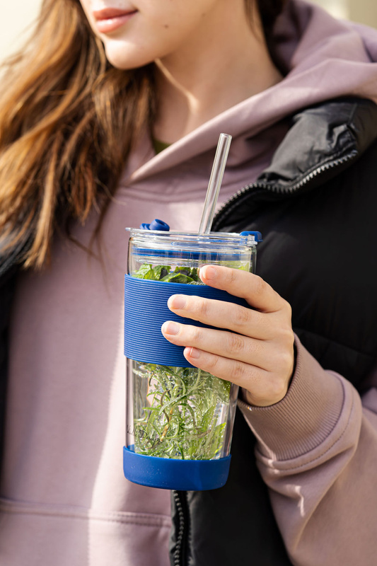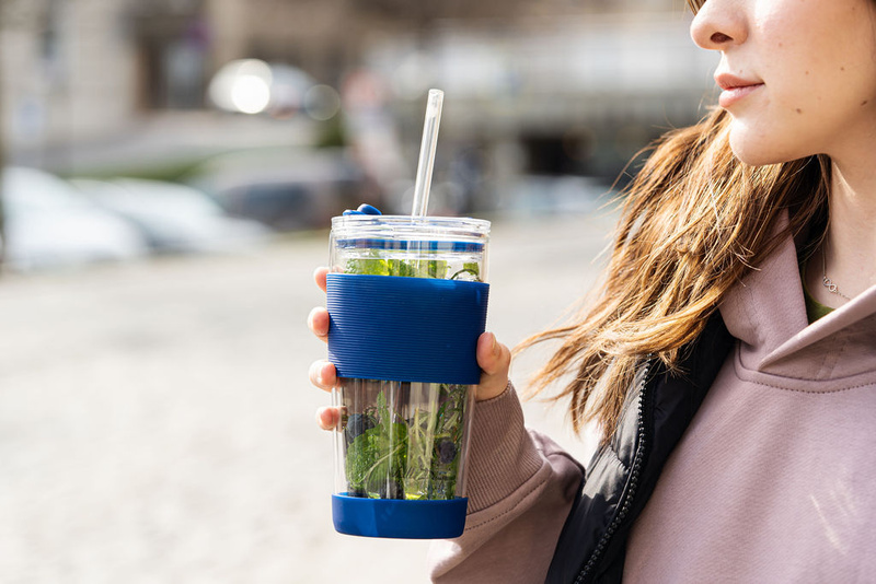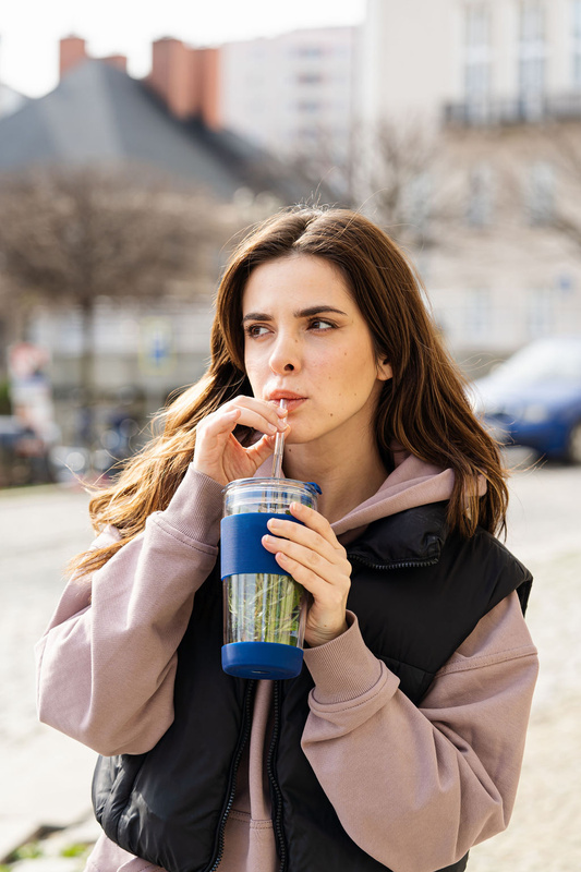 Kubek posiada dwufunkcyjne zamykanie, w zależności od preferencji użytkownika można używać centralnego otworu oraz słomki lub pić bezpośrednio z kubka za pomocą drugiego otworu. Szklana słomka zakończona silikonową końcówką sprawia, że picie jest wyjątkowo wygodne.