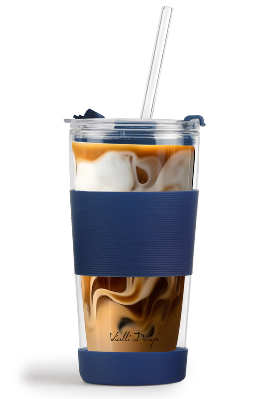 Vialli Design - Kubek termiczny szklany ze słomką 600 ml granatowy Fuori