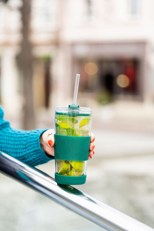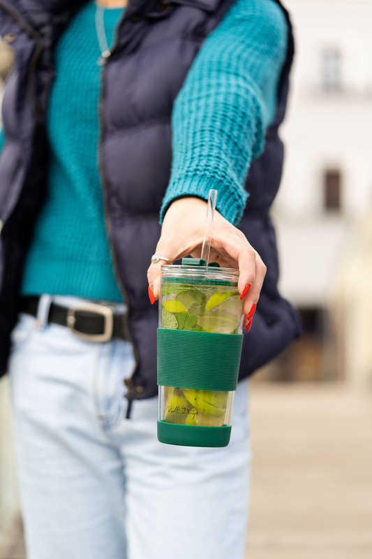 Kubek posiada  dwufunkcyjne zamykanie, w zależności od preferencji użytkownika można używać centralnego otworu oraz słomki lub pić bezpośrednio z kubka za pomocą drugiego otworu. Szklana słomka zakończona silikonową końcówką sprawia, że picie jest wyjątkowo wygodne.