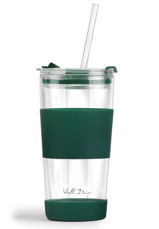 Vialli Design - Kubek termiczny szklany ze słomką 600 ml zielony Fuori
